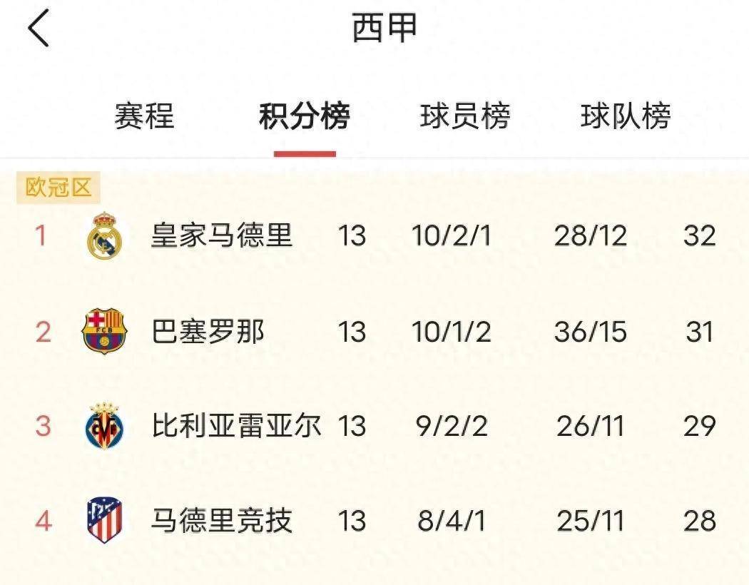 西甲赛场,一夜之间,战局骤然升温,悬念丛生。皇家马德里客场与埃尔切战成2比2平,两度陷入落后却又两度顽强扳平,险些阴沟翻船。与此同时,马德里竞技则凭借对手的乌龙球,1比0险胜赫塔费,以一种近乎无声的方式豪取联赛五连胜。积分榜上,皇家马德里积32分,紧随其后的巴塞罗那积31分,马德里竞技则以28分位列第四。前三名之间仅有4分的差距,西甲冠军的争夺已然演变为一场混乱而激烈的多方混战。